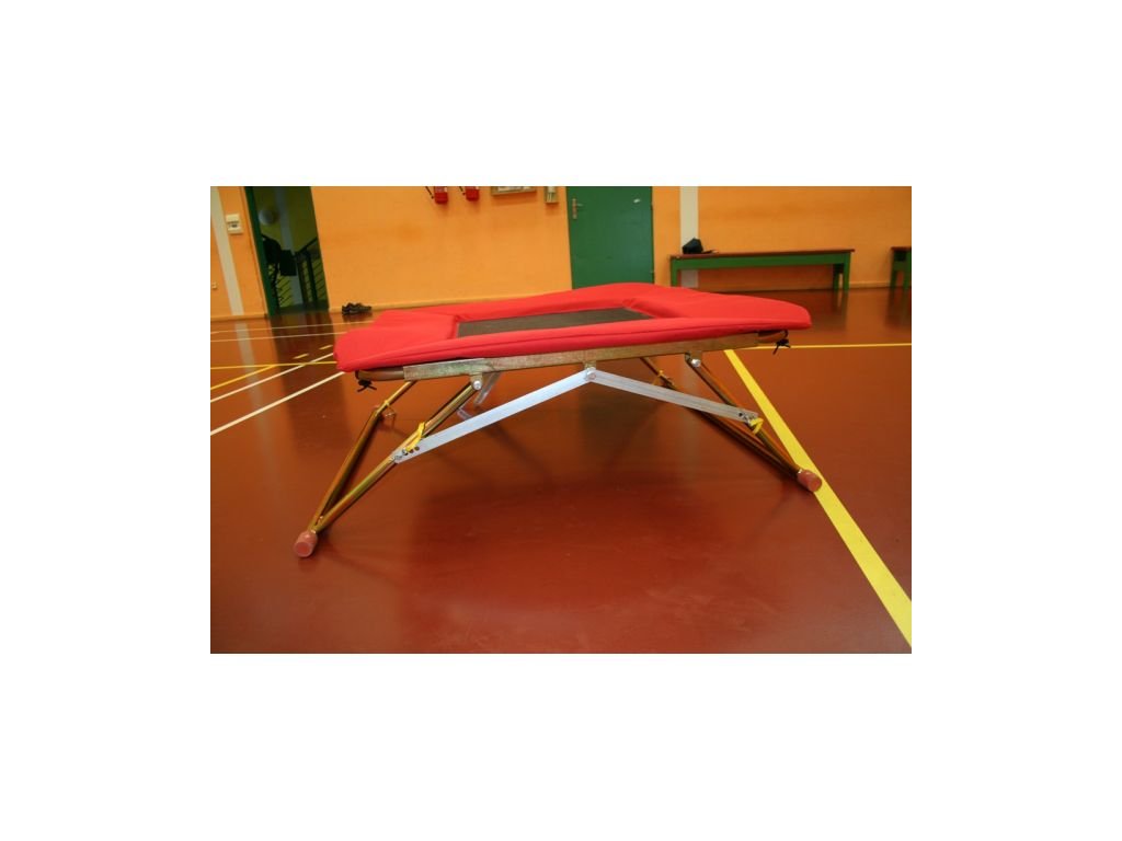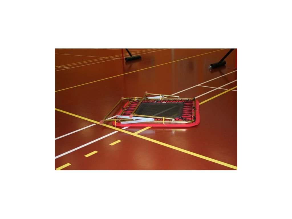 Tato trampolína je velmi oblíbeným sportovním vybavením ve školních tělocvičnách. Kovová konstrukce s nastavitelnou výškou. Konstrukce je povrchově ošetřena zinkováním. Odraziště je vypnuté pružným lanem 10 mm, lano je zakryté ochranným krytem. Maximální zatížení je 95 kg. Venkovní rozměr trampolíny je 110x110 cm, rozměr odraziště je 70x70 cm. Trampolínu lze nastavit do sklonu pro odrazy na gymnastické nářadí nebo vodorovně na běžné skákání. Ochranný kryt s výplní PE pěna vyhovuje ČSN EN 913 dle přezkoušení zkušebny ITC a.s., Zlín. Tento výrobek je možno vyrobit na přání zákazníka i v jiných rozměrech.Doplňkové parametry